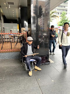Geoff Dyer in his brilliant contemplation on photography, THE ONGOING MOMENT, talks about early 20th Century street photography and the obligatory blind accordion player. In New Zealand, Leon Smith and Nick Spill found a blind Chinese fiddle player on the corner of Queen Street and Commerce Street in downtown Auckland. Notice he is impeccably dressed unlike some the players captured by the likes of Walker Evans, Ben Shahn, Andre Kertesz, Bruce Davidson and Ed Clark. (Note to self: we ain't in that esteemed collection of photographers.)