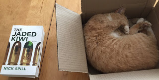 Usually writers post their newly arrived proofs next to their smiling faces.My cat was too excited about my new novel, The Jaded Kiwi, due to be released March 1.