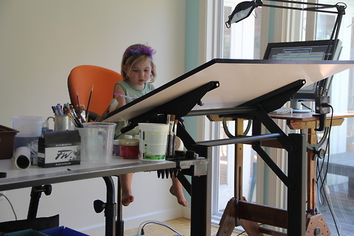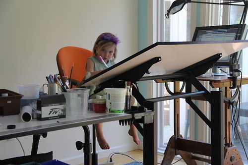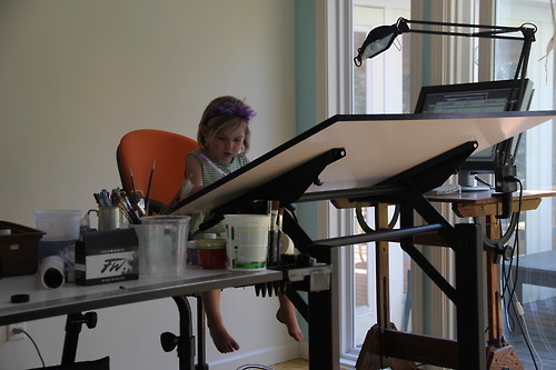 An exciting week at my studio. My very first intern. This seems like a seminal moment for any illustrator; when the hard working veteran can finally outsource the mundane tasks of running errands to the art store, doing research online, or picking up a book at the library to a young, eager busy-body. Of course, as you’ll notice in this photo, I think mine has already taken over. It’s one thing to be helpful, another thing altogether to SPEND ALL DAY SITTING AT MY DESK. To make matters worse, she demands that I raise and lower her in the fancy art chair, as well as “spin her”, get her milk on demand, and “play chase with me.”