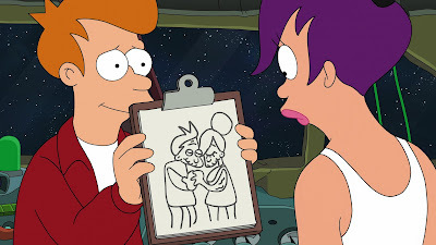 La puntata è sicuramente valida, e riesce a tenere bene il ritmo pur cambiando continuamente situazione. Forse però il dramma di Fry rimane anche troppo tangenziale al procedere della storia, e non viene mai sviluppato a fondo il modo in cui perscepisce una storia dimenticata, tutto quello che succede sono dei flash dai quali si ritrova privo di sensi. Inoltre, anche se la conclusione è a suo modo romantica (ed è una scelta perfetta che a sposare Fry e Leela sia proprio Zapp), il fatto di resettare di nuovo la coppia nel momento in cui riesce a raggiungere la sua unione definitiva è un po' on the nose, e anzi proprio perché sappiamo che per qualche ragione questa cosa non avverrà mai nel canone della serie, appena si vede accadere capiamo che quello che sta succedendo in qualche modo non è "reale" e sarà riscritto. E infatt il plot twist dell'universo alternativo (abbastanza intuitbile dal titolo) ripristina la situazione di partenza. Insomma un altro uso del reset button nel rapporto Fry/Leela che credevamo di esserci lasciati indietro dopo il quarto film.