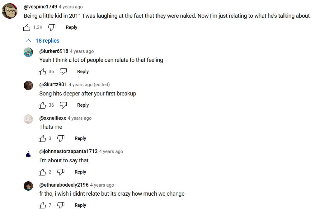 È una cosa che mi piace fare, soprattutto per i video molto vecchi. Vedere le tracce che arrivano da otto dieci dodici anni dal passato. I migliori sono quelli che dopo molti anni sono stati rieditati con un commento a posteriori. E sotto il video di questa canzone, ce ne sono molti, di gente che aveva sentito la canzone nel 2011 e poi l’ha riascoltata nel 2024. Commenti di questo tenore: