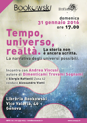 E così, a fine mese, come potete anche leggere sul sito di Zona 42, torneremo a presentare Dimenticami Trovami Sognami, che nonostante abbia quasi raggiunto un anno di età ha ancora qualcosa da dire. La presentazione si svolgerà domenica 31 gennaio, ore 17, alla libreria Bookowski. Ecco la locandina: