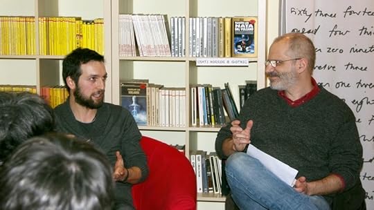 una semplice scaletta, con qualche minuto di presentazione iniziale e una serie di domande, e abbiamo pressappoco seguito quella. Devo ammettere che c'è stata un po' di difficoltà all'inizio, soprattutto da parte mia, nel cercare di descrivere il libro. Il fatto è che mi risulta problematico rispondere a una domanda semplice del tipo "di cosa parla", perché non credo si possa individuare un singolo tema o una singola linea narrativa che può racchiudere tutto il romanzo in poche righe, e qualche inceppamento ci può essere stato, come potete constatare dalla foto qui annessa, in cui se riuscite a cogliere la gestualità potete leggere da parte mia un "ehm, sì, roba così" e di Giorgio qualcosa del tipo "sì, ok, non si capisce ma ce lo facciamo andare bene". Ho comunque cercato di suggerire gli spunti iniziali, forse senza risultare troppo convincente, ma con le domande successive siamo riusciti ad approfondire l'argomento, e probabilmente sono riuscito anche a suscitare un certo interesse, perché gli interventi del pubblico non sono mancati. Non ho ben chiaro quanto sia durato il tutto, presumo un'ora o poco più, ma è stato tutto molto scorrevole. Alla fine solito giro di complimenti e dediche (dico "solito" perché è abbastanza comune alla fine di una presentazione letteraria, non perché ci sono abituato dall'alto della mia esperienza di Autore...), ma anche diverse occasioni di chiacchiere con gli ospiti (qualcuno conosciuto, qualcuno no) a proposito di fantascienza, libri, editoria, cibo, rugby (sì, mi hanno trascinato anche in quello), e personaggi locali, tutto molto colloquiale e distensivo.Cosa posso trarre, stavolta, dalla prima presentazione del nuovo libro? Innanzitutto, DTS interessa, questo sì. Se consideriamo anche che l'ho venduto con l'abilità di una betoniera, è evidente che il contenuto del romanzo ha sicuramente un certo appeal. Nel pubblico erano presenti (pressappoco in egual misura) persone che lo avevano già letto e che non lo conoscevano, e l'interesse era alto per entrambi gli schieramenti. Le domande che abbiamo ricevuto (non solo io, anche l'editore) non sono quelle di circostanza per l'autore esordiente, ma ben studiate e circoscritte, stimolanti da ricevere. Di questo siamo rimasti molto contenti sia io che i miei mecenati di Zona 42. Certo, può anche darsi che il pubblico fosse filtrato dalla location stessa: la Miskatonic University è un tempio dedicato alla narrativa d'immaginazione, e davvero, se siete anche nel raggio di 100 km vale una visita, io ho passato almeno mezz'ora a frugare negli scaffali e alla fine da bischero che sono non mi sono deciso a prendere niente, ma ho visto titoli da salivazione molesta (che poi ho sfogato su ravioli di patate e gnocchi fritti, ma questo è un altro discorso), e una grande attenzione anche per l'underground italiano, con una buona rappresentanza di autori e case editrici di medio-piccolo livello. Quindi, se non siete venuti per DTS, andateci per centinaia di altri motivi più validi, mi raccomando.