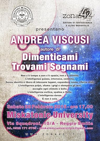 La presentazione si svolgerà sabato 28 febbraio alle ore 17 alla Miskatonic University di Reggio Emilia, una libreria di recente apertura vocata alla narrativa fantastica in tutte le sue forme: fantasy, horror, fantascienza, e tutti i derivati. Sarebbe quindi il contesto ideale per presentare il mio nuovo libro, poiché il pubblico dovrebbe già essere avvezzo a questo genere di opere, ma le sorprese (in positivo o negativo) sono sempre possibili.