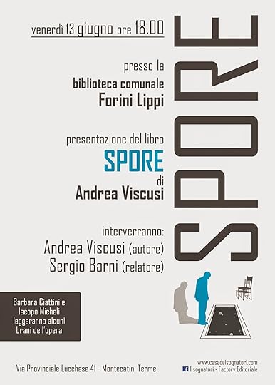 La presentazione si svolgerà venerdì 13 giugno, negli spazi esterni della Villa Forini Lippi, sul retro della biblioteca dove in estate viene fatto il cinema all'aperto. A presentarmi questa volta sarà Sergio Barni, con la collaborazione della biblioteca stessa che ci farà da supporto e contribuirà con le letture di alcuni brani. Inizieremo verso le 18 e andremo avanti fino alle 19:30 circa, orario di chiusura della biblioteca a partire dal quale dovremmo lasciare il suolo pubblico! Ecco la locandina, che potete diffondere a piacere: