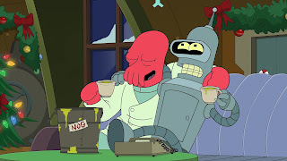 Sugli episodi di natale sono sempre un po' scettico, perché visto che sono in qualche modo forzati a includere certi elementi, a volte finiscono per diventare un po' ripetitivi. Nel caso di Futurama, natale significa Robot Santa che minaccia di sterminare la popolazione e in particolare i protagonisti della serie. Ora, avere un villain che è un pericolo serio e materiale è una buona cosa, ma trovarsi ogni volta a cercare un modo per "sconfiggere" Santa forse porta inevitabilmente a storie forzate.Stavolta gli elementi di base della storia sono due, un ottimo e uno pessimo. Quello ottimo è la coppia Zoidberg/Bender, che non si era mai vista prima in tutta la serie. Nelle ultime stagioni c'erano state delle coppie anomale, come Bender/Hermes o Amy/Nibbler, ma questa combinazione ancora non si era vista. I due si trovano gli unici da soli durante le feste, visto che non hanno una famiglia con cui passare il natale, e quindi dopo aver bevuto un po' decidono di "rovinare il natale" agli altri in modo che siano costretti a tornare con loro. Un po' infantile, ma credibile per un drama queen come Bender e un disperato come Zoidberg che si sostengono a vicenda (evidentemente la ragazza di Stench and Stenchibility l'ha mollato offscreen, avrebbe fatto piacere un riferimento a Marianne). Il fatto che poi i due arrivino a "uccidere" Santa e cercare di occultarne il corpo dà spazio ad alcune gag efficaci.