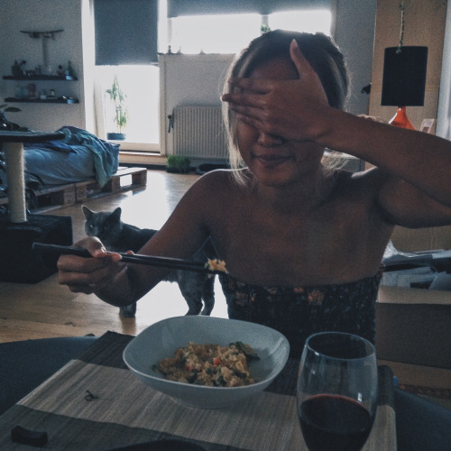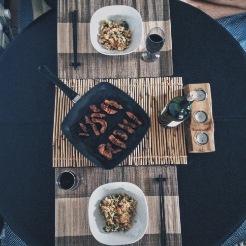 Asian night on our flying carpet dining room (homegrown) chili and garlic fried rice with grilled teriyaki pork Shoutout to my dad for these rad special chopsticks!