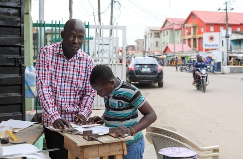 “When I was the age of this boy, my father had a stroke. My family used all our savings to take care of him. And after we’d spent everything, my father gave up the ghost. We were left in a desperate situation. There was no money left. There were six of us living in a single room. I was only in 5th grade, but I had to go to work. I carried oranges on my head and sold them in the street. Then one day I met the owner of a print shop. He was a friend of my brother. He fed me every afternoon, and he began to teach me his profession. He told me: ‘Never view yourself as having nothing.’ And he showed me that I could change my life with skills alone. Now I have my own shop. And anyone who has an interest, I will teach them. I’ve taught fourteen boys already. This boy has stopped going to school. But we can’t allow him to be idle. We must keep him busy because there’s criminality all around us. Every day we see drug dealers walk by. I point to them and I ask: ‘Do you want to be like them? Or do you want to be like me?’”