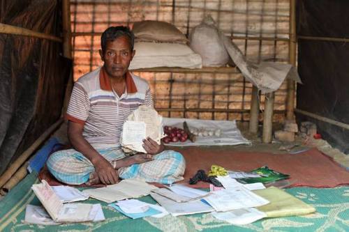 “I looked out my window and saw smoke coming from the village across the river. At first I thought it was a casual fire. But then I heard shooting, and I saw people were trying to swim across the river. We knew that our village would be next. I grabbed what I could carry and ran toward the mountain. We hid in the bushes all day. There were thousands of us on that mountain. Anyone who tried to talk was shushed. We looked down on our village and watched them burn our houses. Before they burned mine, they carried everything out. They took all my furniture. They took two hundred bags of lentils. I’m a schoolteacher, but I owned a lot of farmland. I paid taxes on my land for decades. I have all my paperwork. I have all my receipts. But they took it all from me. I wasn’t able to bring a single grain of rice with me. These papers are all I have. They are worthless now. But my hope is that one day they’ll have value again.”