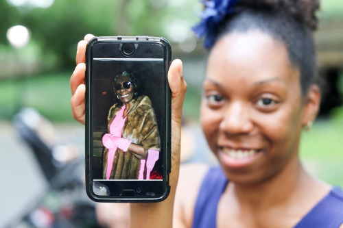 “Gram died right before Mother’s Day last year. She grew up in Georgia and spent most of her childhood working in the cotton fields. She dropped out of school after seventh grade. She moved North with her family and started working in a button factory. My mom was her only child. They both almost died during childbirth. Gram raised Mom all by herself, and after we were born, she helped raise us too. My friends called her Diva Miss Eva. She’d roll down the window of her Oldsmobile to tell people to pull up their pants. And she loved pink. We took this picture on the day my mom graduated from community college. It was in the middle of June. It was so hot. But Gram comes outside in a pink evening gown, mink fur, and evening gloves. We told her it was too hot but she said: ‘My baby’s graduating!’ She loved this photo. She put it in a frame and hung it above her pink bed. In her pink room.”