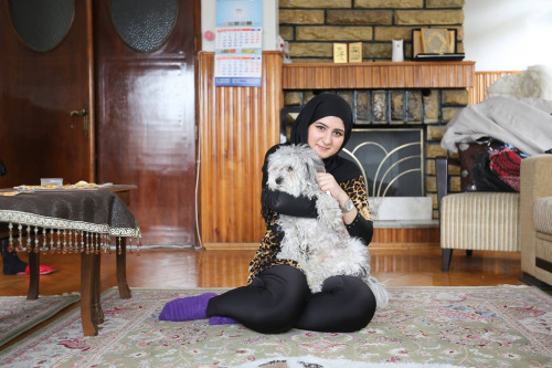(7/11) “George is my refugee dog. We’ve been through many horrible things together. I found him in Baghdad when he was just a puppy. My father and I were driving down the road and I saw some teenagers holding George by the ears and hitting him. I jumped out of the car and begged them to stop and gave them all the money I had. George was so thin and dirty, and the doctor said he was very sick and he’d only survive if I took perfect care of him. And look at him now! He’s been with me through Iraq, Syria, Turkey… everything. Whenever he sees me crying, he jumps in my lap and uses his paw to pull my hands away from my face.”