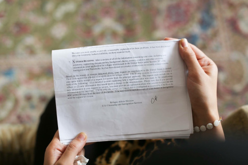 (10/11) “It was like a nightmare. I fell on the floor and started screaming: “No, no, no!’ I cried for days. I couldn’t go to work because my eyes were so red. I went to the hospital and they had to give me medicine to calm me down. Security related reasons? What can that mean? They don’t know my family. I know my family. My father was a train driver. Every male in our country had to do military service for six months when they were young, but he only did the radar. He swore to me that he’d never even touched a gun in his life. Our family loved America. My father always told me about America. He made us go talk to American soldiers during the war. Other people were afraid of Americans, but he told us they were here to help us and not to be afraid of them. He told us that America was a place where so many different people lived in peace. So many religions. So many communities. We loved America! Every day we watched Oprah. My father promised me that one day we would go on her show and meet her. We even wrote about Oprah for our assignments in school. Why would we ever hurt America? All of my dreaming ended on the day this letter arrived. I became a person without hope.”