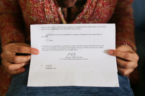 (¾) “We’ve been waiting for two years now. We’ve been through all our interviews. Last week this letter came and said that we’ve been ‘deferred.’ I’m not even sure what that means. We were very truthful about everything. We have nothing left in Syria. I want to continue working as a doctor in America. Here my hands are tied. Refugees are not allowed to work. I don’t have papers. I can’t communicate with anyone. I worked my entire life to become a doctor. I did nothing but study for six years. I didn’t even have a hobby. Now I’m doing nothing. I’m losing hope. I’ve started to wonder if it would have been better for us to go the illegal way across the sea.”