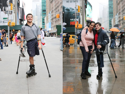 Big news. We’ve got our first 100% confirmed HONY romance! I photographed Alex about eight months ago while he was rollerblading through midtown. Apparently, after seeing the post on HONY, Jordan sent him a Facebook message saying: “I can’t even rollerblade on two legs.” Intrigued by Jordan’s eloquence, Alex arranged a meeting and they spent a day together. They’ve been dating ever since. I was lucky enough to run into them on the street a few days ago, and they told me the entire story. We were even close enough to our original meeting spot to go back and recreate the original photograph.