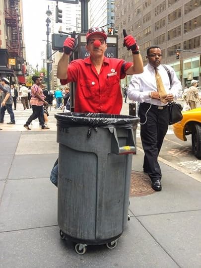 Of course the time I leave my camera at home, I run into this guy. Had to snap a pic with my phone anyway. He was making farm animal noises at passing pedestrians. “Got to make the best of it,” he said.