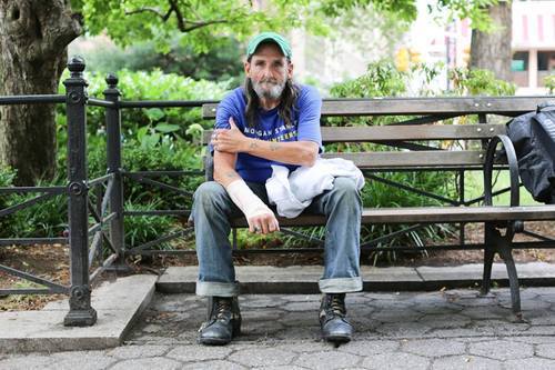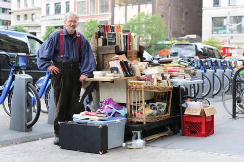"I built this book cart after my bagpipes got stolen, because I couldn’t afford a new set of bagpipes, and I needed to support myself. I used to sell teddy bears too. But one day last year, three undercover policeman showed up and took me to jail. It was just like a TV show— one was dressed like a rapper, the other like a hooker, and the other like a tourist. They said you need a permit to sell manufactured goods. You’re allowed to sell art, just not manufactured goods. I tried to tell them that my teddy bears were art because I dressed them and customized them. But all they said was: ‘You’re going to jail.’ I had to spend 2 days in jail. The judge threw out the case. But they never gave me back my teddy bears."