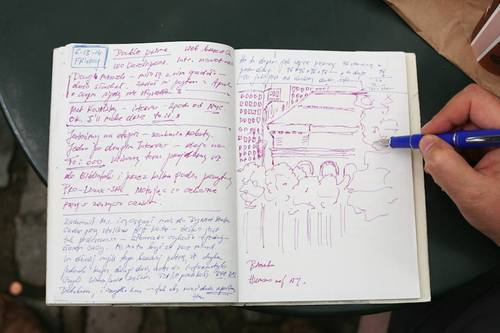 "I recently lost my job in IT. When I started working over thirty years ago, computer technology changed slowly. It was like going from a skateboard, to a bicycle, to a motorcycle, to a car. Now it’s changing so fast I can’t keep up. Every five years it goes from a skateboard to an aircraft carrier. So I’m sitting here sketching the library to keep from going nuts."