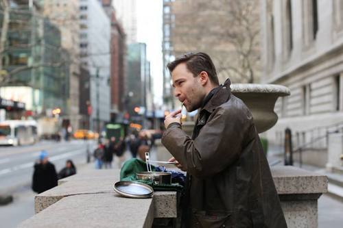 "I found this guitar on the sidewalk last night. But my girlfriend thinks it has bedbugs. So I’ve got to play outside."