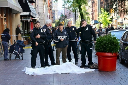 I am one of the officers in this picture. My friend found it in your book and pointed it out to me. The victim under the sheet was a woman in her late fifties. She was Miss Austria in her early 20’s and a contestant in the Miss World pageant. At the time of her death she was destitute and alone, but still carried her passport with a photo of her at the peak of her beauty. She was stunning. On October 22nd of last year, wandering the halls of the building she had chosen for her last act, she had looked for an open window at the record company that produces Maroon Five. Asked to leave, she found one a floor above in a hallway, took sleeping pills, sat on the ledge in the sunlight for about ten minutes, then leaned forward. Anyway, thanks for the photo. It is one of those souvenirs of one’s life that come to be valuable because it has unexpectedly captured a moment of you doing your life’s work, genuine and unrehearsed.