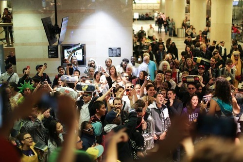 I was photographing in Penn Station late last night when I heard screaming and loud music. A huge crowd of people came around the corner. Everyone was dressed in costumes and bright colors. One dude was dressed as a rabbit. Another had a giant, flashing, neon sword. Everyone was laughing, dancing, and singing, as very loud dance music blared from a portable sound system.