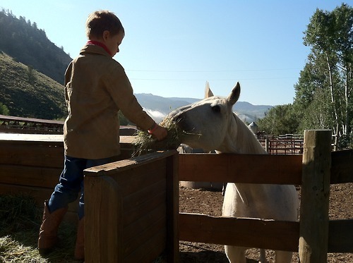 "He got quite good at identifying a significant number of the herd (they have 121) and would get up early to watch them come in from pasture, feed them, and would stay at the stables until late to feed them again and watch them go out at night. Just being with the horses, feeding them, watching them, getting to know them, being treated like a regular ranch-hand by the wranglers who let him lug around buckets of feed in the mud…that really was the most soul-filling thing for him. He is a different person for this."