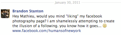 In honor of HONY’s one millionth Facebook “like," here’s a screenshot of the message I sent to all my friends and family on day one. I remember it was kind of embarrassing, and I winced a little bit every time I hit “send." But, hey— you’ve got to start somewhere.