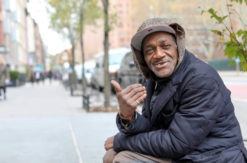 “I was working as a prep cook at a BBQ joint in Harlem. I got off work early one day, and I discovered my wife with another man. That was the beginning of all this. I’d been with her for twenty-one years. I was devastated. I got right back on the bus and headed back to the city. I went straight to the bars on 42nd Street. I got wasted every day. I lost my wallet, my phone, my contacts. I didn’t want to do nothing. I just said ‘F it.’ I’ve been out on the streets for eight months. When it’s time to rest, I find a place to sleep. But I spend most of my time here on this block. These are the best people on this block. I’ve never experienced so many good people in my life. Some of them help me out every single day. They say: ‘What are you doing out here? We’ve never met anyone like you.’ Lily and her daughter brought the whole family to meet me on Thanksgiving. I felt like a celebrity. Then there’s Cheryl with the glasses who just walked by a couple minutes ago. Love her. John and his wife, love them too. David and Michael are the best. And what’s up to my man Sean from the beauty parlor. Shout out to T and Marianne. So many good friends on this block. But they aren’t going to see me much longer because I found a program that’s going to give me a place to stay, and a job cleaning the streets. I’m done with this life. I don’t belong here. And I know my grandkids miss Grandpa. So if you don’t see me here soon, you can say: ‘He’s done it! He’s gone!’ But I’m going to shock everybody. Cause I’m coming back with Christmas cards.”