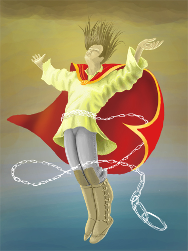 My main goal tonight was to help right some wrongs I had with the figure and the perspective. I cleaned up the red cloak, changed the collar and such to aid the form of the figure. I shortened the waist a bit. Tilted the head back--face is still sketchy--and had some fun with the updraft of wind in his hair. He is fairly malleable still, as long as I keep everything on dozens of layers. Seperating shapes from shading workds well for me.