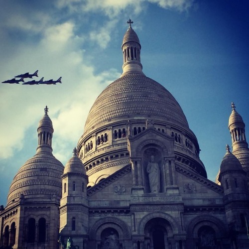 When you happen to land in Paris the same day as the World Cup parade & see French Rafale jets performing a victory dance. (at Montmatre; Sacré-Coeur)