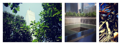 We reached our emotional saturation point inside of three hours, and stumbled up to the plaza in search of the Survivors’ Tree. This callery pear (upper left tree) survived the towers’ collapse with little more than its trunk, but was nursed back to health for nine years in the Bronx. It now stands tall, scars and all, in the foreground of another symbol of resurrection: the Freedom Tower.