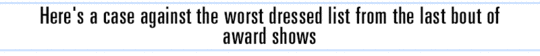 When I look back at the award ceremonies I do watch: The Golden Globes, The Emmys, The Oscars, it is rare that I should find myself as interested in the subject matter being honored (film, television, etc) as I am in the outfits, the implications of the outfits, the mannerisms of the celebrities, the general notion of Celebrity and so forth.