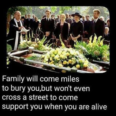 There are memes like this all over the Internet - exercises in self-pity. Nobody loves me. Everybody hates me. I think I'll eat some worms and blame you all for all my troubles. So is the meme above true? Will family not cross the street to see you when you are alive but will only show up for your funeral? That depends on whether or not you've crossed the street to support them. Some people spend their lives sitting in their own little box waiting for people to make them happy, to meet...