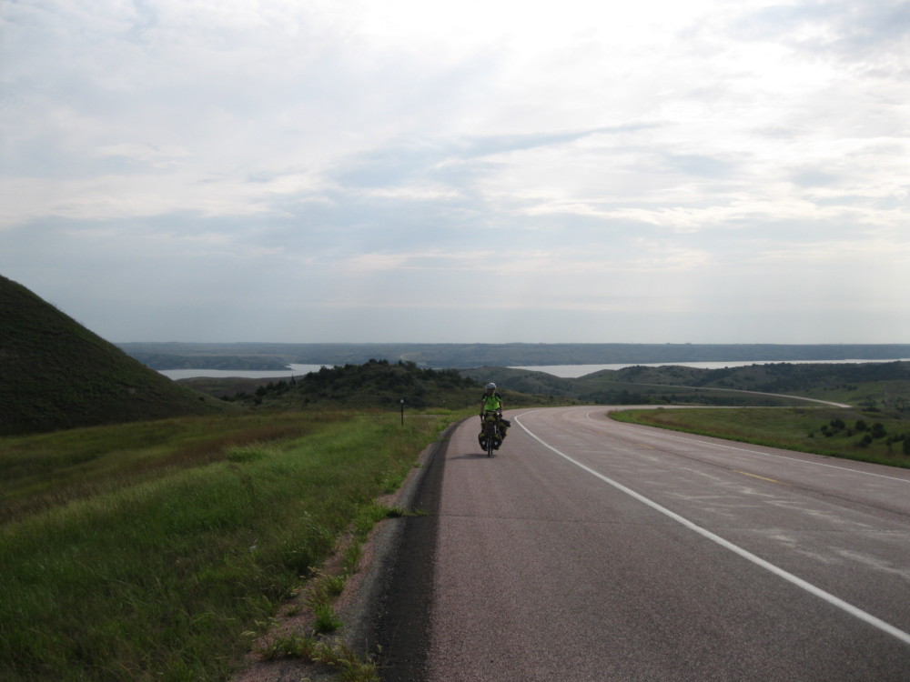 After yesterday’s stiff wind and short day, we opted for an earlier start to the day today. We were off toward Pickstown just shortly after 7:30. By 10 am, we rolled over the Fort Randall Dam on the Missouri River and into Abby’s for breakfast, with 26 miles to our credit. Skies were overcast, yet the wind still relatively calm. We felt justified in our earlier start.