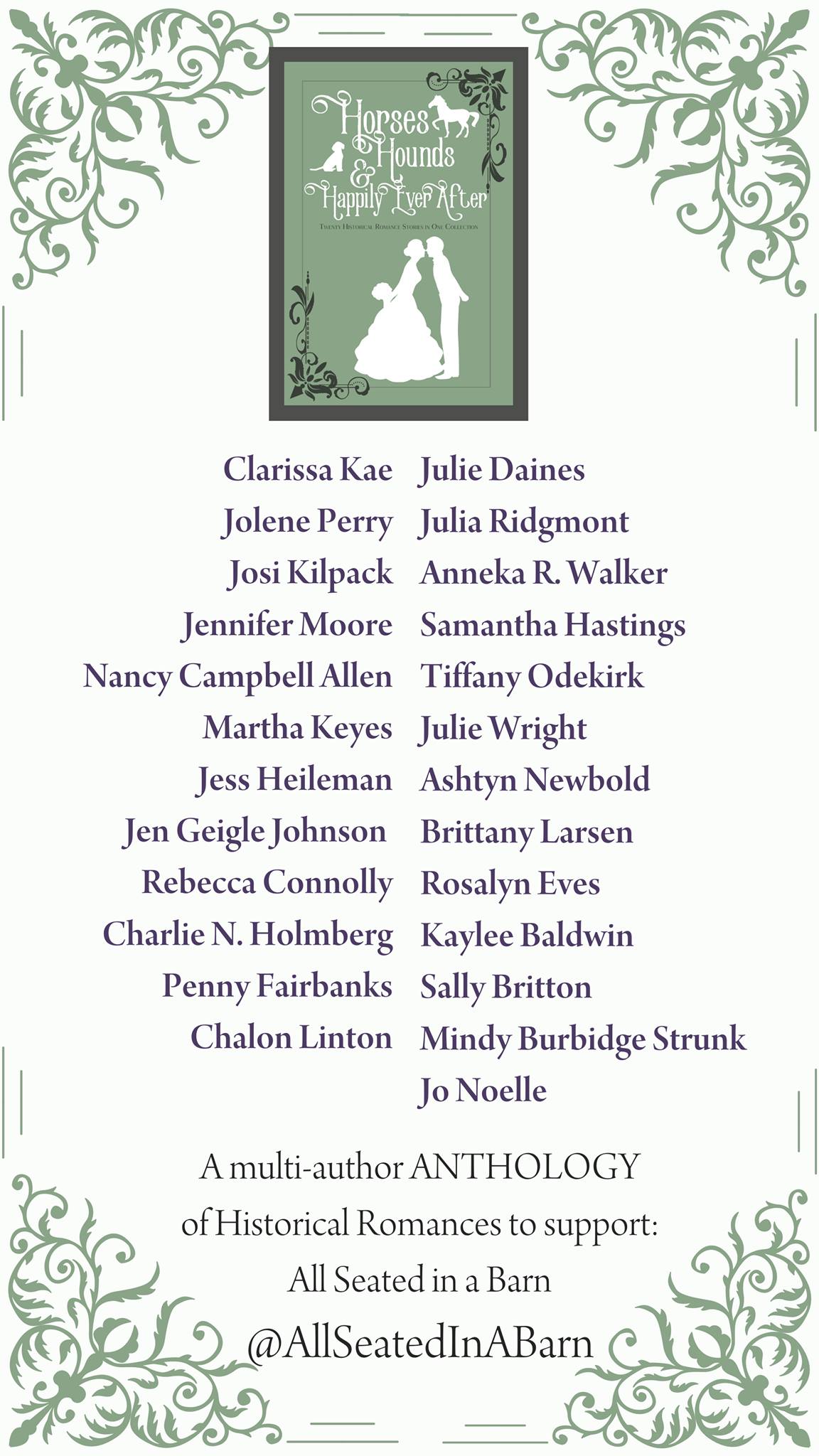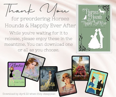 I'm so thrilled to partner with these incredible historical romance authors to present the anthology, HORSES, HOUNDS & HAPPILY EVER AFTER. All proceeds go to the animal rescue charity: All Seated in a BarnComing May 3, 2022.You can preorder it now, for just $0.99 cents! That's only $0.03 cents a story. AmazonEverywhere else
