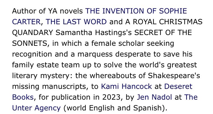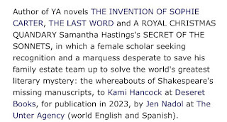 I'm delighted to announce that Covenant Communications has purchased my next book, SECRET OF THE SONNETS!