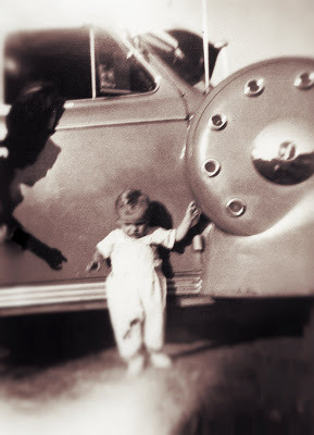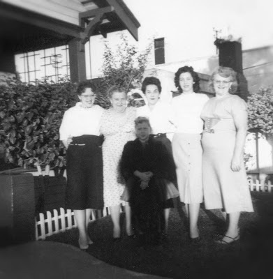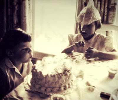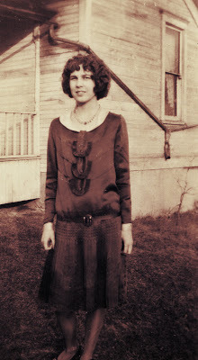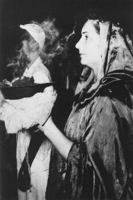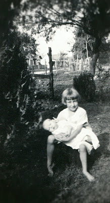 She is in shadow whereas everyone else is in sunlight. There are no shadows behind her. She is shorter and smaller than the others. It is not a double-exposure. It is a real photograph.