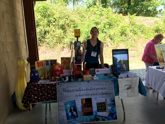 But back to Rebekkah Niles. When I found out I had a booth at the Exhibitor Fair, I knew right away that I wanted to share it with another emerging author. Rebekkah’s book captured my imagination when I heard excerpts at a speculative fiction writers group we both attended. She’s also an HCRW (RWA) chapter mate, so I know she’s a good sort. But go look at her {website}. Did you read her header? We write in different subgenres -I’m inspy, she’s not – but tea! broken people! I knew we could champion each other’s works.