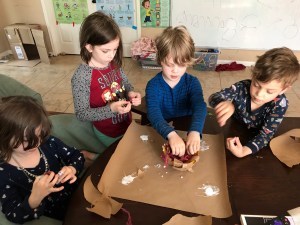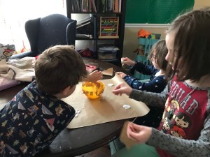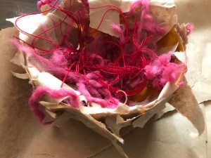 To set up this prayer opportunity, start with a plastic bowl (or make a papier mache bowl if you’re really crafty and have lots of time). With your children, tear small pieces of brown paper and glue them to the inside and outside of the bowl. (We gave each child a little puddle of glue for dipping the paper.) Have them untwist little sections of yarn, and glue the yarn to the bowl, concentrating the fluff on the inside.