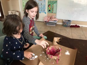Materials: Plastic or papier mache bowl, school glue, brown paper such as packing paper, bits of yarn or string; plastic eggs; small printouts of photos of loved ones.