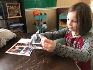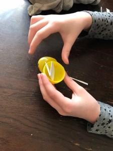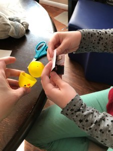 Once the bowl is ready, print out photos of loved ones for whom you would like to pray. Have a child cut them out, or help them with this step. Work together to fold or roll the photos to fit inside the plastic eggs.