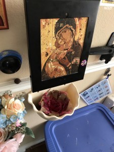 I read the news and make my cross and kiss the Theotokos, who really gets it. She knows what’s going on, what it’s like. I look at Jesus and just nod. He’s acquainted with grief. I search for outdoor icons. I want them in my garden, too.