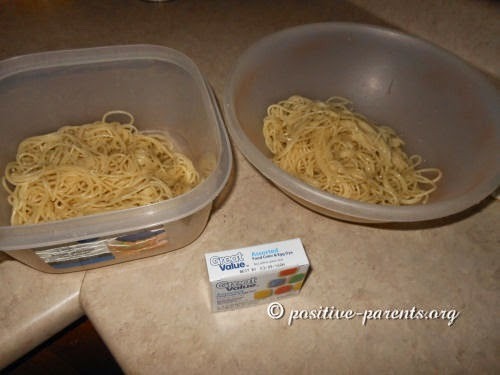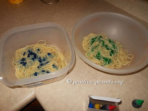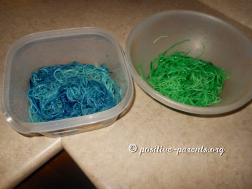I started by cooking some spaghetti noodles, then coloring them with plain food coloring.
