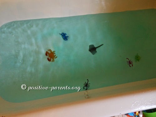 Next, I added a few drops of green food coloring to their bath water. Note: This does not stain the kids or the tub. Then I added what few creatures I could find.