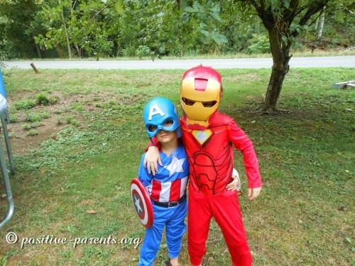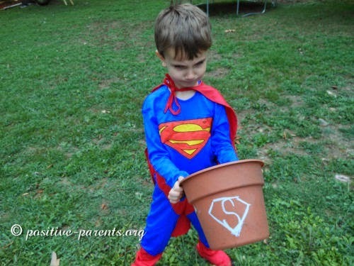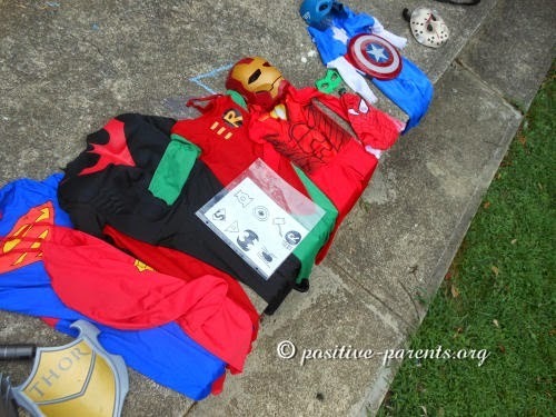 I then explained the rules. Look for superhero symbols I've hidden around our house. When you find a symbol, you run back to the corresponding superhero's costume and dress up as that superhero before moving on to find your next symbol. When you do find the next symbol, you come back and dress up as that superhero, and so forth. Of course, there was quite a bit of villain fighting in between the symbols searches which made for a great time!