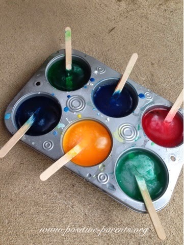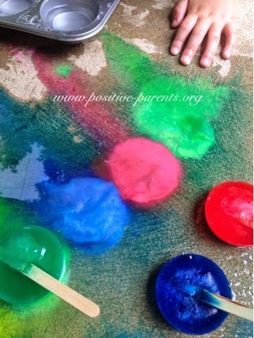 Today's activity was ice chalk mixing. To create ice chalk, I mixed equal parts corn starch and water in a muffin pan, added food coloring, and froze with a craft stick inside.