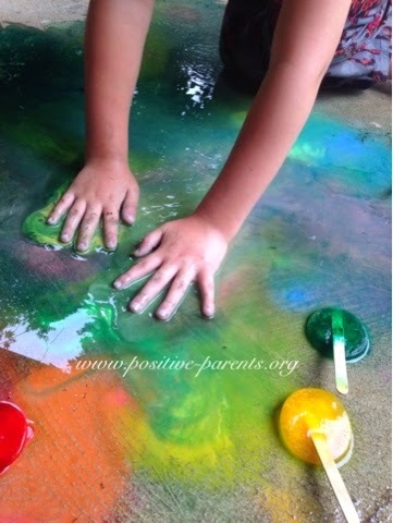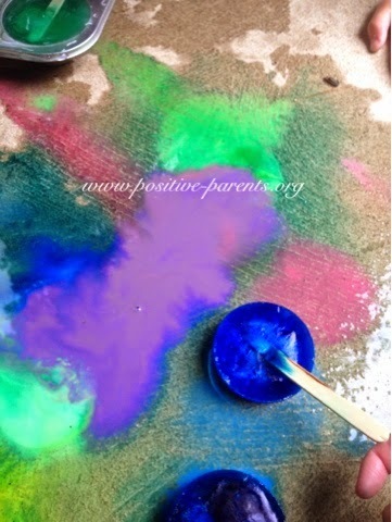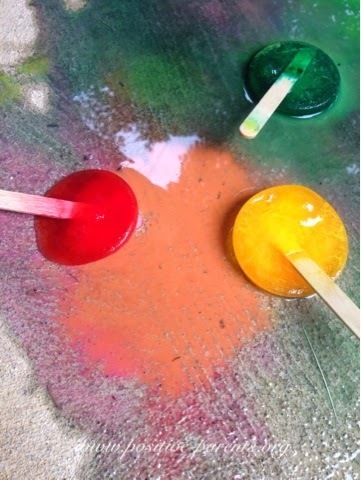 I imagined they'd be able to paint with them, but it didn't quite work that way. We dunked them in water and they started to melt a bit, but still they were useless for drawing. However, we turned it into a great color mixing activity! This was a fun way to demonstrate how yellow and blue make green, red and blue make purple, red and yellow make orange, and so on. They really enjoyed mixing the colors and seeing all the combinations they could make.