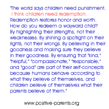 Redemption restores honor and worth. How do you redeem a wayward child? By highlighting their strengths, not their weaknesses. By shining a spotlight on their rights, not their wrongs. By believing in their goodness and making sure they believe in their goodness. By ensuring that "kind," "helpful," "compassionate," "responsible," and "good" are part of their self-concepts because humans behave according to what they believe of themselves, and children believe of themselves what their parents believe of them.