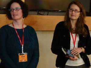 Notice how I lovingly caress My Book. (giving presentation with Lisa Alber, novelist and buddy)