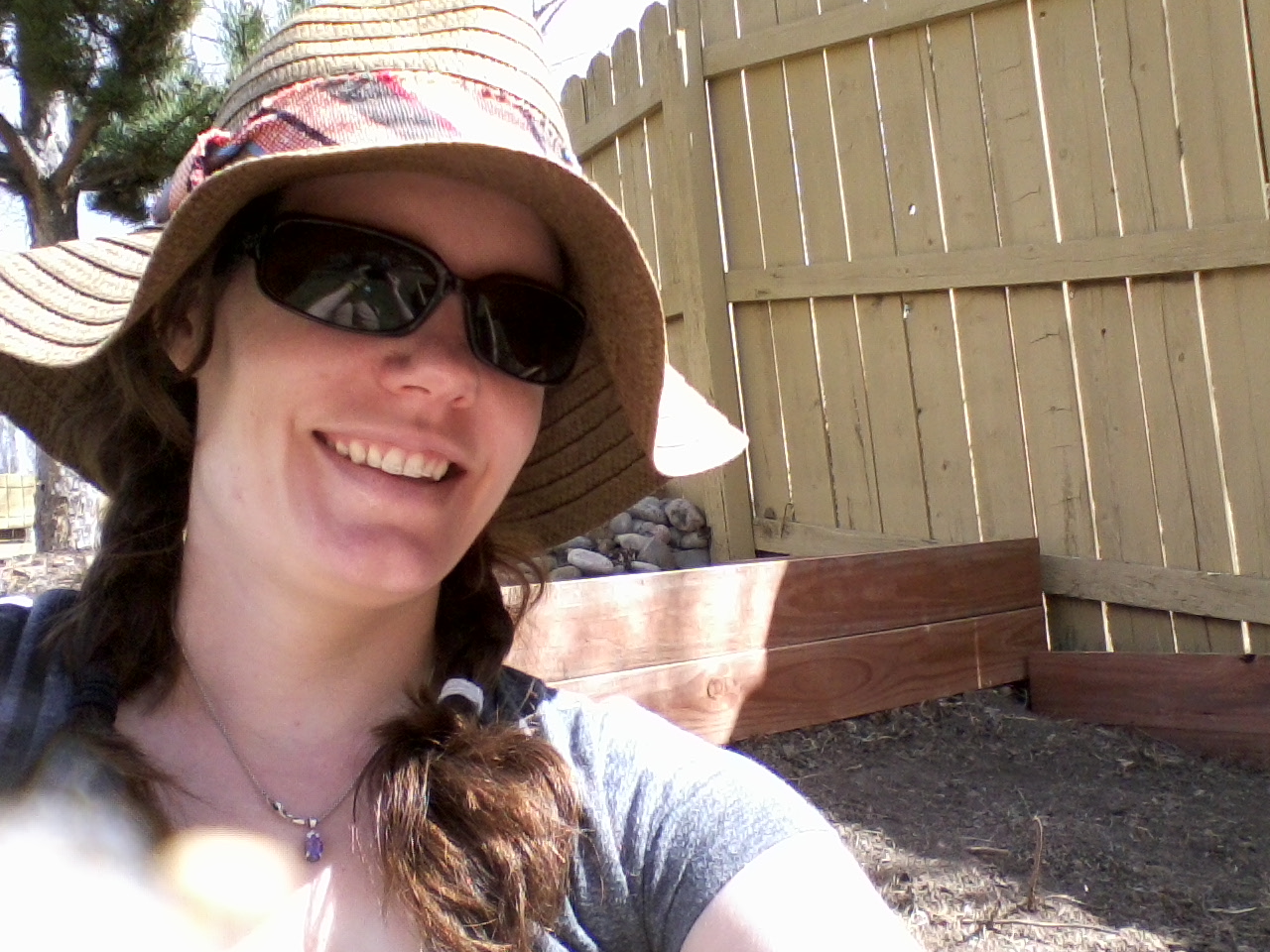 See how level it is?One of the wonderful things we created at our home this year is a backyard veggie garden. The yard has a little hill in it, so it was quite a bit of work to lay the boards so they were flat. Lots of digging, a little frustration but we finally got it to look like this:And afterwards I looked like this:
