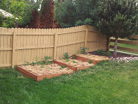 We've had stuff in there for almost exactly a month, and boy is it growing! This is the whole garden. The tall green plants along the fence are tomatoes and green peppers, with beans starting to climb the trellises.